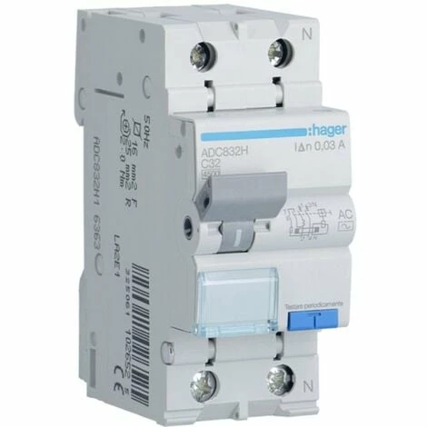 Thermomagnetischer Differenzialschutzschalter von Hager, 2 Module, DIN-Anschluss (universell für jede Schalttafel auf dem Markt), 1P+N, 32 Ampere, Ausschaltvermögen 4,5kA, Bemessungsspannung 240 Vac, Bemessungsdifferenzstrom 30mA, Typ AC, Auslösekurve C.