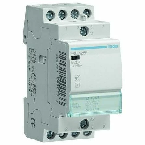 Hager Installationsschütz brummfrei 25A 4 Schließer 230V. Schütz brummfrei nach EN 61095 und DIN VDE 0637-3 sowie Berührungsschutz nach DIN VDE 0106 Teil 100. Reiheneinbaugerät mit Kontaktstellungsanzeige durch Anzeigefenster, integriertes Beschriftungsfeld und