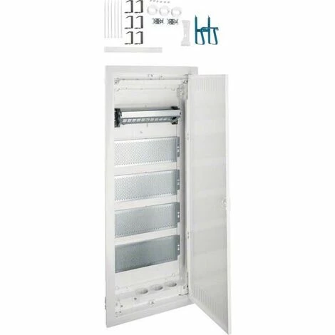 Multimedia, volta, UPV, 3-reihig, mit geschlitzter Stahlblechtür. Installationskleinverteiler Unterputz aus Kunststoff, nach DIN VDE 61439-3, geeignet zum Einsatz in Wohngebäuden nach DIN 18015 und zum Einbau von schutzisolierten VDI Komponenten. Schutzart IP30, Schutzklasse II schutzisoliert. Bestehend aus: Kunststoff-Mauerkasten mit serienmäßigem Leitungsabfang, ausbrechbarem Leitungseinführungsschieber mit Schnappbefestigung, integrierter Wasserwaage und verzinkten Stahlblech-Befestigungslaschen. Verdrehbarer Blendrahmen mit Lüftungstür aus Stahlblech, pulverbeschichtet und eingebrannt, mit 15 mm Putzausgleich. Lüftungstür, frontbündig mit innenliegenden handbedienbaren Scharnieren. Türverschluss mit frontbündiger Griffmulde und selbsttätig zurückklappendem Griff, Türanschlag rechts oder links ohne Blendrahmen-Demontage. Oberer Anschlussraum: Patch Panel und DIN-Hutschiene isoliert aufgerastet zur Aufnahme von unterschiedlichen Kommunikationsmodulen, für den geforderten Funktionspotentialausgleich nach DIN EN 50310 (VDE 0800-2-310) sind am Patch Panel 2 Schraubbefestigungen vorhanden. Beschriftungsmöglichkeit mit beiliegendem Bezeichnungsstreifen zur Portbeschriftung. Vormontierte gelochte Montageplatten aus verzinktem Stahlblech mit 3,2 mm Lochung sind eingebaut. Ein Universalhaltebügel kann für die schraublose Befestigung von VDI-Komponenten direkt auf dem Lochblech eingehängt werden. Im unteren Anschlussraum ist eine 3-fach Schutzkontaktsteckdose (90 Grad drehbar) montiert. Über eine Anschlussklemme sind die Steckdosen direkt anschließbar. Die Steckdosen sind mit einer beiliegenden Schutzkontaktabdeckung zur Einhaltung der Schutzklasse II bestückbar.